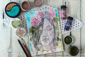 Mixed Media Place-August challenge /flowers, female silhouette and colors-pink, green, purple, pale blue/